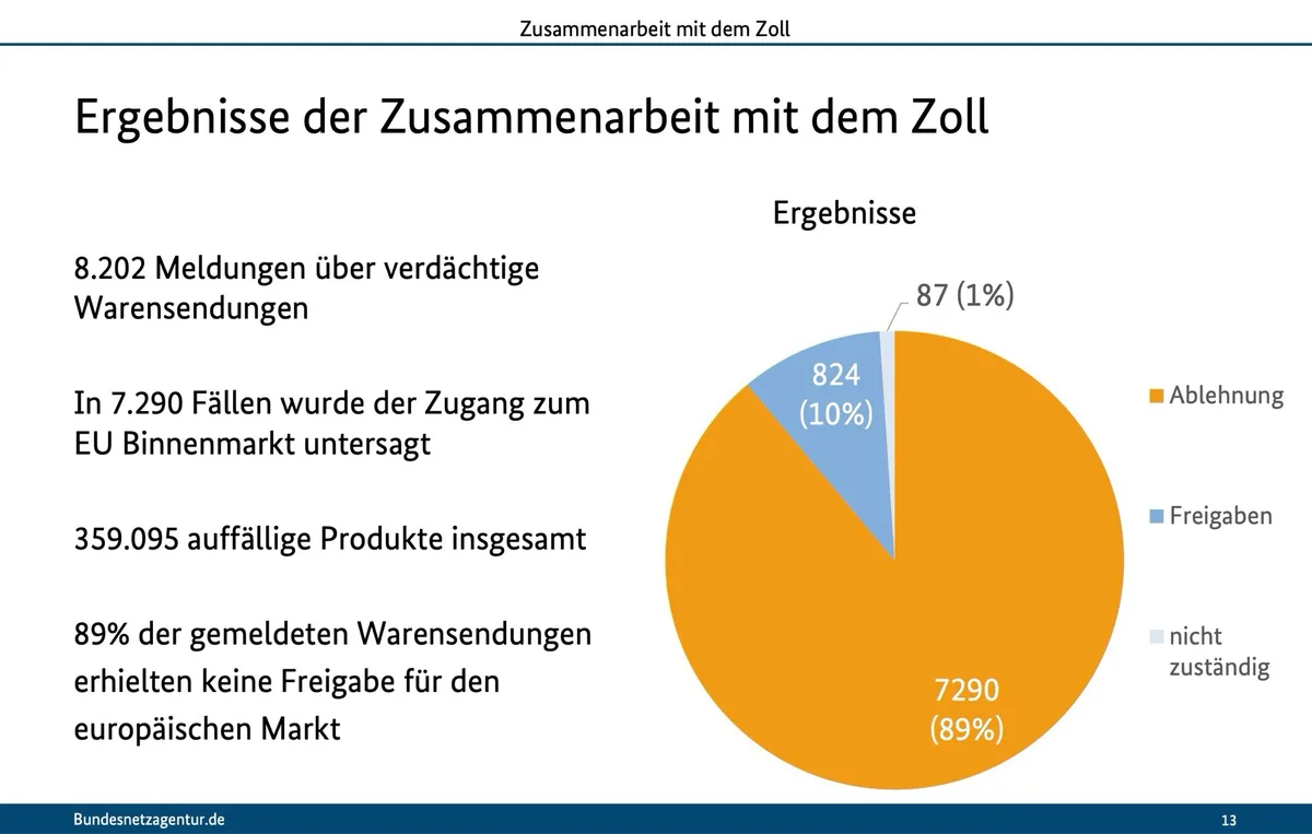 Ca măsură de aplicare, Bundesnetzagentur a indicat că importul a 359.000 de produse a fost oprit la vamă. Din 8.202 transporturi pe care vama le-a considerat suspecte, 89% s-au dovedit neconforme cu directivele, un semnal că o parte relevantă a problemelor de siguranță și conformitate intră în piață prin lanțul de aprovizionare și ajunge în retail înainte de a fi depistată.